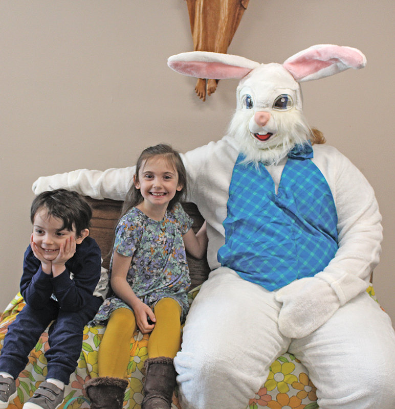SITTING WITH THE EASTER BUNNY — Ryker and AdieLyn Groves, children of Dan and Amy Groves, enjoyed a visit with the Easter bunny at the Glenwood City Community Easter Egg Hunt this past Saturday at Holy Cross Lutheran Church. —photo by Missy Klatt