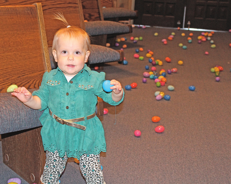 LOOK WHAT I FOUND! Olivia Brahmer, daughter of Brent and Sarah Brahmer, enjoyed looking for eggs at the Community Easter Egg Hunt held at Holy Cross Lutheran Church on April 9. —photo by Missy Klatt