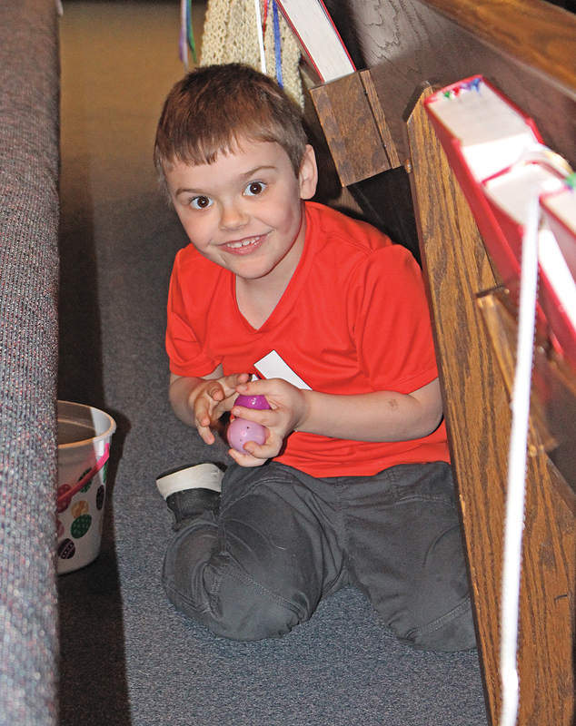 INDOOR EGG HUNT — Due to the muddy conditions, the Glenwood City Community Easter Egg Hunt was held indoors at Holy Cross Lutheran Church last Saturday, April 9. Landen Eliason, son of Barb and Jim Eliason, looked between the pews for the best eggs. —photo by Missy Klatt