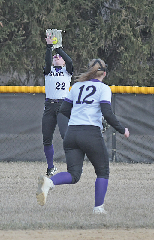 FLY BALL CATCH — Boyceville centerfielder Cambrie Reisimer (#22) caught this fly ball while teammate Hannah Dunn (#12) looks on during the Bulldogs’ Dunn-St. Croix conference softball opener played at home Monday, April 11 against Spring Valley. —photo by Shawn DeWitt