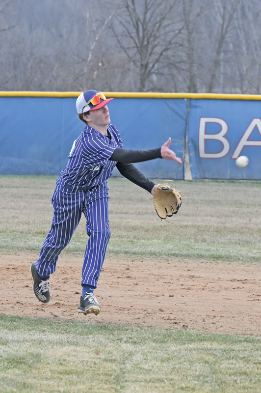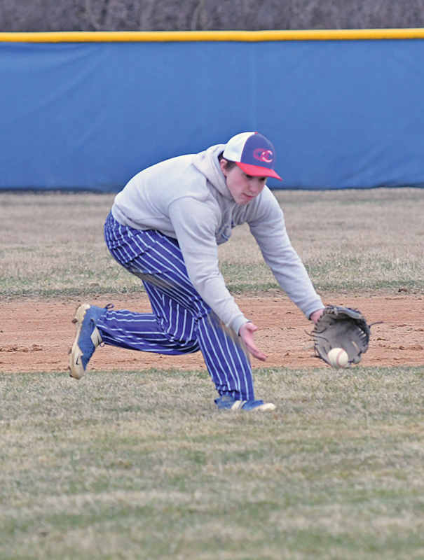 GLENWOOD CITY third baseman Noah Brite hustled to scoop up this ground ball and fire it to first base to record an out during the Hilltoppers home baseball opener against Colfaxz April 28. After leading 5-1 early, Glenwood City lost the contest 11-8 in ten innings. —photo by Shawn DeWitt