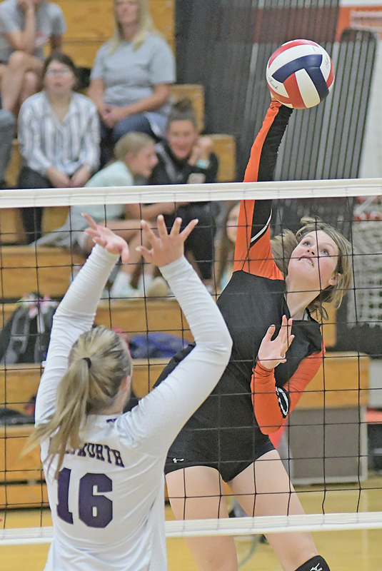 ELK MOUND senior Stella Rhude hit this shot between a pair of Ellsworth blockers during a home quad last Thursday, September 8. The Mounders finished 1-2 in the quad. —photo by Shawn DeWitt