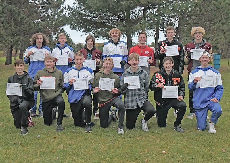 THE 2022 DUNN-ST. CROIX All-conference boys’ cross country teams were determined at the conference meet held at Whitetail Golf Course on October 13. The top seven finishers, pictured in the front row, earned first-team honors, runners 8-14 received second-team awards and are shown in the back row. Front row (L to R): Conner Davidson, Durand (7th); Trae Schaefer, Elk Mound (6th); Elek Anderson, Glenwood City (5th); Aiden Schiferl, Elk Mound (4th); Landon Clark, Mondovi (3rd); Ian Hazen, Elk Mound (2nd); and JJ Williams, Glenwood City (champion). Back row (L to R): Zeb Holden, Glenwood City (14th); Ilan Anderson, Glenwood City (13th); Brody Gregg, Spring Valley (12th); Anthony Nelson, Glenwood City (11th); Ashton Yarrington, Colfax (10th); Caleb Beskow, Elk Mound (9th); and Logen Vorlicek, Spring Valley (8th). —photo by Shawn DeWitt