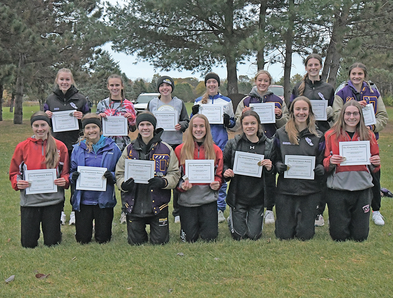 THE 2022 DUNN-ST. CROIX All-conference girls’ cross country teams were determined October 13 at the conference meet held at Whitetail Golf Course. The top seven finishers, pictured in the front row, earned first-team honors, while runners 8-14 received second-team awards and are shown in the back row. Front row (L to R): Molly Heidorn, Colfax (champion); Courtney Stadter, Mondovi (2nd); Lauren Peterson, Durand (3rd); Kaysen Goodell, Colfax (4th); Ellie Schiszik, Elk Mound (5th); Haylie Rasmussen, Boyceville (6th); and Aynsley Olson, Colfax (7th). Back row (L to R): Jaden Stevens, Boyceville (8th); Lydia Hannack, Spring Valley (9th); Ferrari Wallace, Durand (10th); Elsja Meijer, Glenwood City (11th); Chloe Auth, Durand (12th); Ashlynn Maska, Boyceville (13th); and Holly Plumer, Durand (14th). —photo by Shawn DeWitt