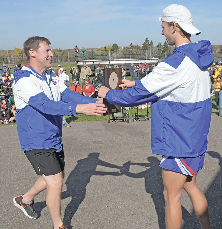 GLENWOOD CITY head coach Matthew Schutz received the sectional runner-up plaque from senior JJ Williams after the Hilltopper boys finished in second place at the WIAA Division 3 Cadott Cross Country Sectional on Saturday, October 22. Williams won the individual championship to help lead the Toppers to a state berth. Glenwood City will compete at the state meet this Saturday, October 29 in Wisconsin Rapids. —photo by Shawn DeWitt