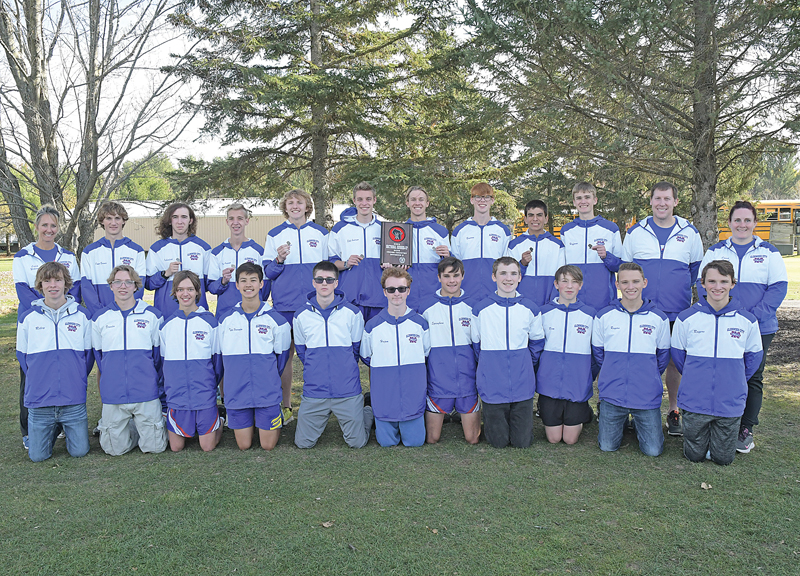 THE GLENWOOD CITY boys’ cross country team finished second at the WIAA Division sectional meet held at Whispering Pines Golf Course in Cadott October 22 and earned the program’s first trip to the state meet. Front row (L to R): Riley Krueger, Jonas Draxler, Garrett Gross, Tyler Harrington, Micah Simmons, Evan Hojem, Elliott Springborn, Morgan Kohls, Ben Standaert, Tyler Rogers and Justin Rogers. Back row (L to R): Assistant coach Angela Williams, Connor Berends, Zeb Holden, Ilan Anderson, Anthony Nelson, Elek Anderson, JJ Williams, Owen Bauman, Sal Stillday, Clayton Hoffman, head coach Matthew Schutz and assistant coach Becky Lamb. —photo by Shawn DeWitt
