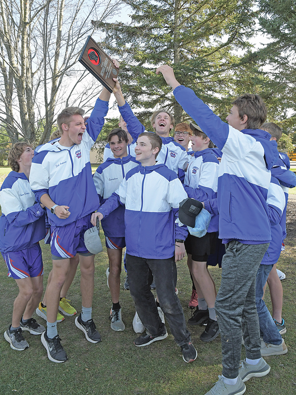 HILLTOPPERS’ CELEBRATE — With seniors Elek Anderson (left) and JJ Williams hoisting the sectional runner-up plaque, the Glenwood City boys celebrated their second-place finish at the Cadott Sectional meet and the program’s first-ever trip to the state cross country championship this Saturday in Wisconsin Rapids. —photo by Shawn DeWitt