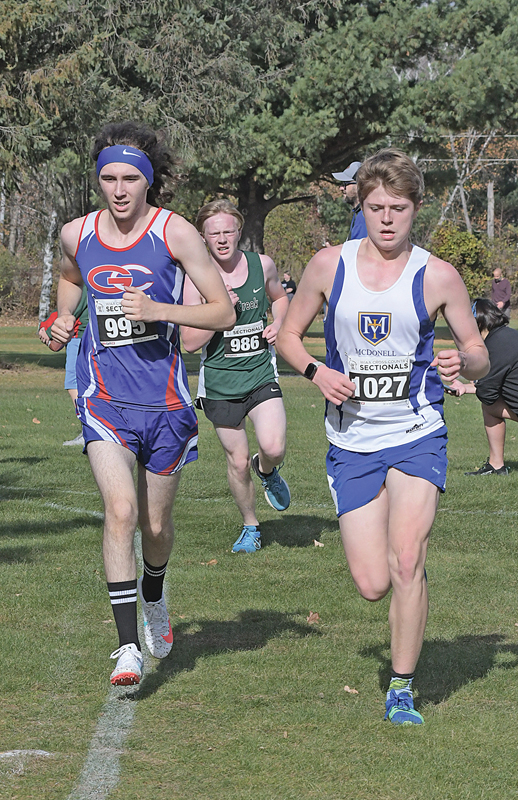 GLENWOOD CITY sophomore Zeb Holden (left) is shown competing in WIAA Division 3 Cadott Cross Country Sectional held October 22. Holden finished 24th for the Topper boys with a time of 18:52.5.