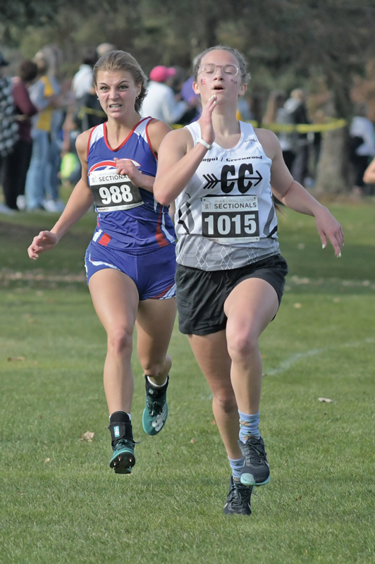 SPRINT TO THE FINISH — Topper junior Haylie Hannah tried to catch a Loyal/Greenwood runner as she sprinted to the finish of last Saturday’s WIAA Division 3 cross country sectional meet in Cadott. Hannah placed 59th. —photo by Shawn DeWitt