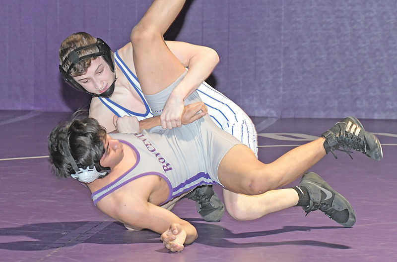 QUICK PIN — It took Glenwood City’s Peyton Rassbach just 37 seconds to score the pin against Boyceville’s Alex Obermueller in a 132-pound match in Boyceville January 12. Glenwood City went on to defeat host Boyceville 62-18. —photo by Shawn DeWitt