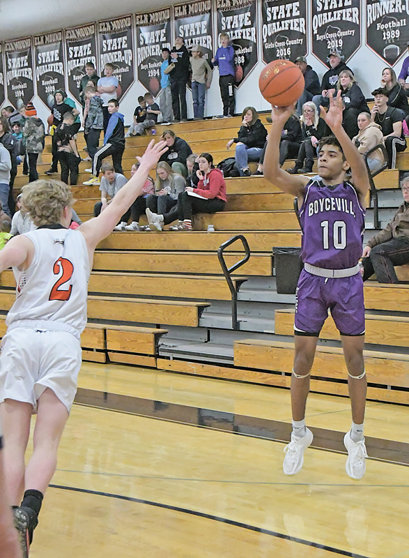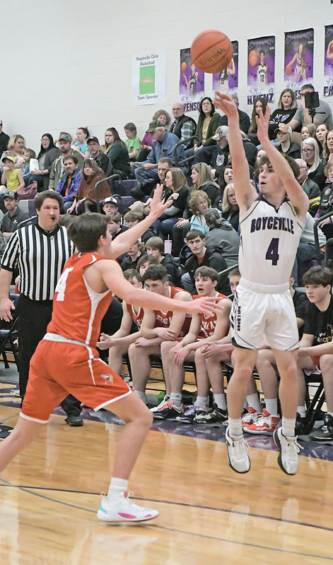 LONG-RANGE ARTIST — Boyceville junior Caden Wold prepared to release a three-point shot during the ?Bulldogs game in Elk Mound Thursday, February 9. Wold scored 22 points which included six from beyond the arc as the Boyceville nearly pulled off the upset, losing 58-50. —photo by Shawn DeWitt