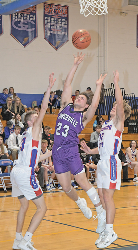 BOYCEVILLE senior Jack Phillips (#23) split Topper defenders Elek Anderson (left) and Max Janson (right) to get off a shot during a February 17 game in Glenwood City which the Bulldogs won 50-31. —photo by Shawn DeWitt