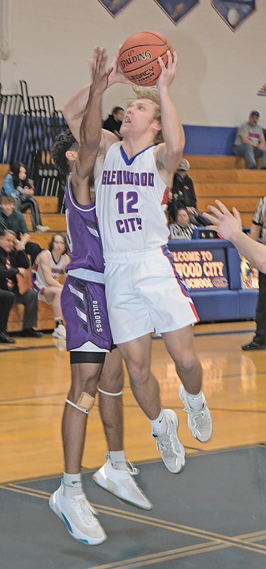 GLENWOOD CITY senior Elek Anderson put in this jump shot for two of his seven points in a home game against rival Boyceville February 17. The Bulldogs sweep the series with a 50-31 win. —photo by Shawn DeWitt