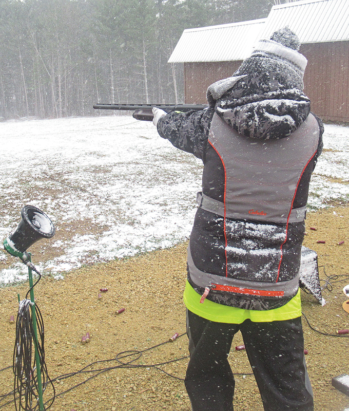 WHILE snow builds up on him Lane Unruh breaks a clay pigeon during Colfax Scholastic Trap Team’s league shoot on April 16. —photo submitted