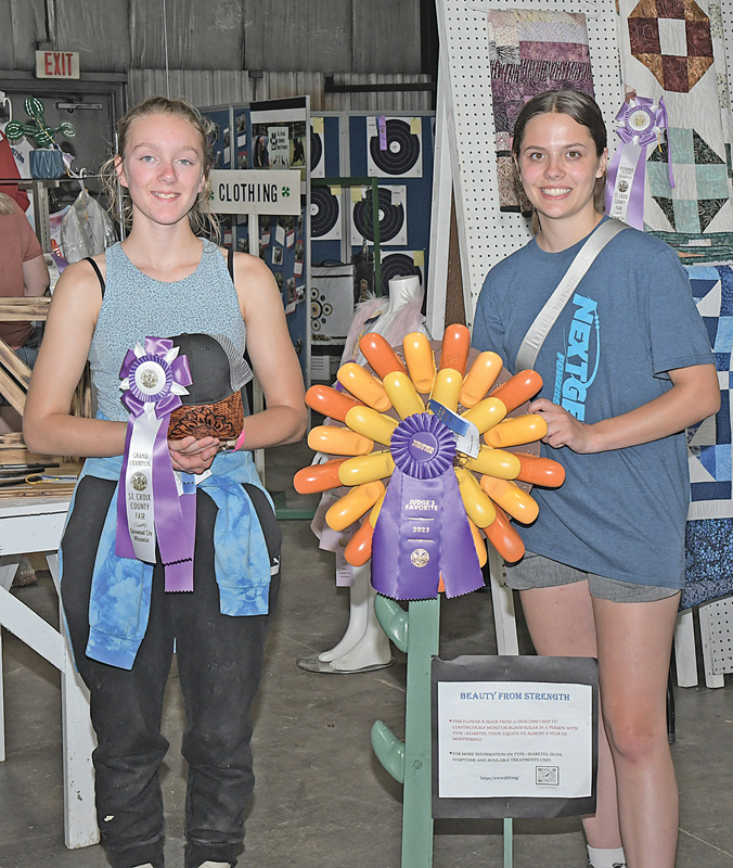 PAIR OF PURPLE-RIBBON WINNERS — Two Glenwood City High School students earned purple ribbons at this year’s St. Croix County Fair. Elsja Meijer (left), of the Glen Hills Climbers 4-H Club, won the Grand Champion award in leathercraft for her highly-decorated, leather-billed baseball cap and Anaka Eliason, a member of the Bellringers 4-H Club, was awarded the Judge’s Favorite ribbon and a WI State Fair entry in Self-Determined projects for the large flower she made from Continuous Glucose Monitor (CGM) applicators.