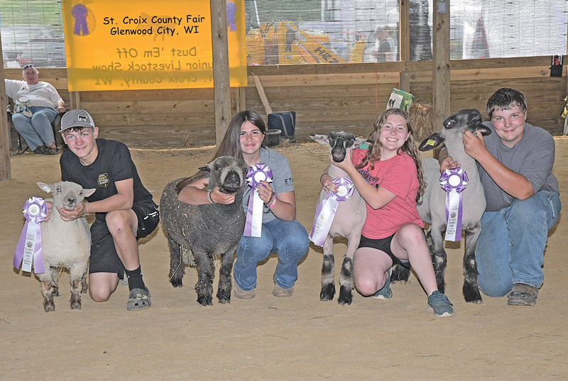 WOOLLY WINNERS — Area youth captured some top awards in the 2023 St. Croix County Fair sheep show. From left to right: Jacob Hager stood in for Jordan Hager of the Dry Run Go-Getters 4-H Club who showed the Reserve Supreme Wool Ewe; Katelynn Bazille, another member of the Dry Run Go-Getters 4-H Club, exhibited the Supreme Wool Ram; Ryleigh Woodford, Oakland Ramblers 4-H, had the Supreme Meat Ewe; and Aden Bazille, a member of the Oakland Ramblers 4-H Club, showed the Supreme Market Lamb.