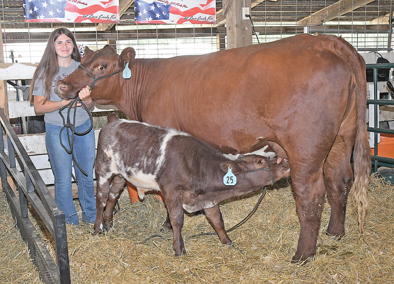 KATELYNN BAZILLE of the Dry Run Go-Getters 4-H Club showed the Supreme Cow-Calf pair and the Supreme Bull Steer Calf during the Beef Show at this year’s St. Croix County Fair which was held July 19-23 in Glenwood City. —photo by Shawn DeWitt