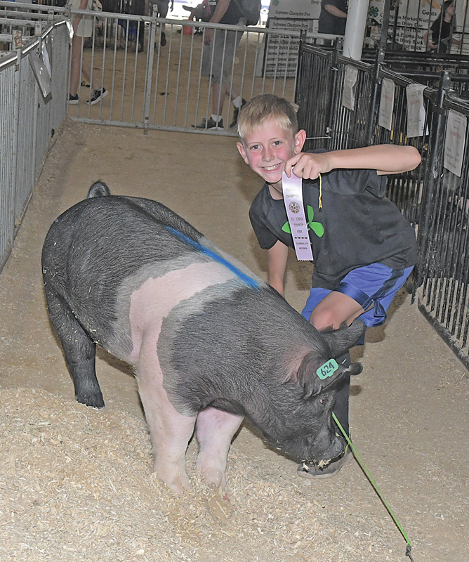 WAYLON WAGNER of the Bellringers 4-H Club took home a Reserve Champion Ribbon for his market barrow which he won in the 2023 St. Croix County Fair’s Swine competition. —photo by Shawn DeWitt