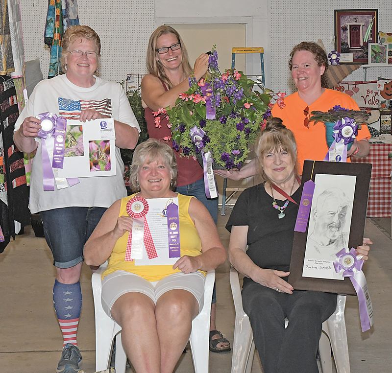 THESE FIVE area women were highly decorated for their Open Class entries in this year’s St. Croix County Fair which was held July 19-23 in Glenwood City. In front, from left to right, are: Barb Standaert (Glenwood City), Honorable Mention and Champion on her poem and Barb Schrank (Glenwood City), Reserve Grand Champion award in Fine Arts for her Charcoal Drawing. Back row (L to R): Missy Klatt (Downing), Reserve Grand Champion in Photography; Charlotte Rock (Glenwood City), Reserve Grand Champion for her Hanging Flower Basket; and Carole Schurtz (Emerald), the Grand Champion in Flowers and Houseplants – Potted Plants. —photo by Shawn DeWitt