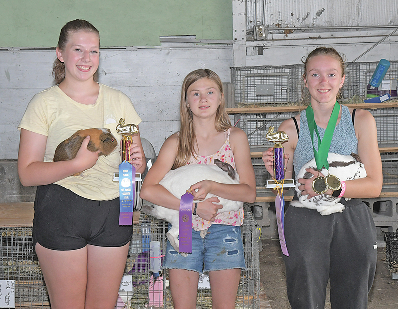 RABBITS AND CAVY — These three members of the Glen Hills Climbers 4-H Club scored some championship awards in the rabbit and cavies competitions at this year’s St. Croix County Fair. From left to right: Emily Tews claimed the Grand Champion Cavy and Best of Show awards on her Guinea Pig “Skippy”, Aletta Meijer won a champion ribbon and was Best in Class with her Californian rabbit, and Elsja Meijer won Best in Fancy, Best in Class and Reserve Grand Champion on her English Spot rabbit and was also named the Champion Senior Rabbit Showman. —photo by Shawn DeWitt