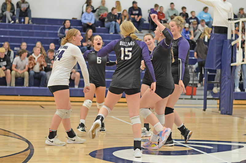 CELEBRATION TIME — Bulldog volleyball players Hannah Dunn, Mercedes Barstad, Delaney Olson, Chelsi Holden, Cora Leslie, and Zoey Hellendrung celebrated a kill during the October 17 regional quarterfinal at Unity High School. —photo by Ali McRoberts
