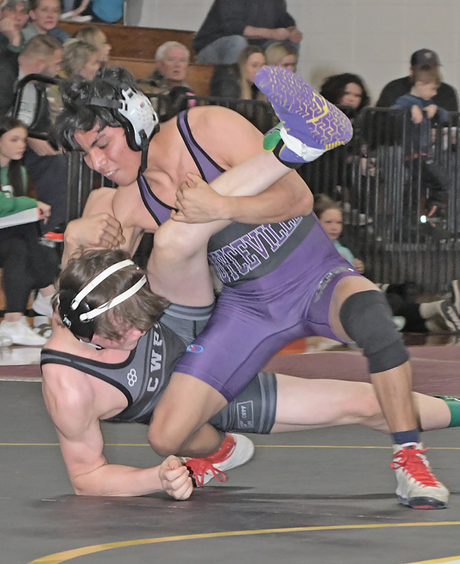 BOYCEVILLE junior Rony Ramos took Chetek-Weyerhaeuser’s Anthony Gregoire to the mat during a match at 126 pounds at the December 1 Turtle Lake/Clayton Wrestling Invitational. Ramos, who went 4-0 on the evening, scored a pin just one minute into the match.