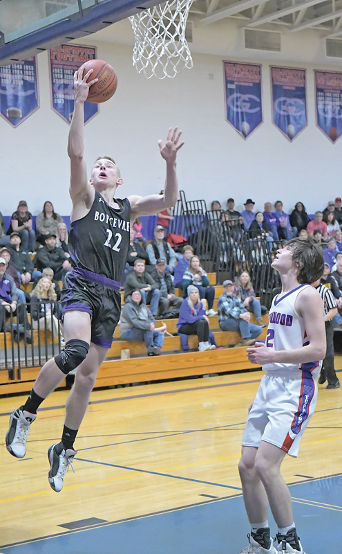 BULLDOG senior Devin Halama (#22) scored two of his 15 points on this layup in a January 11 boys’ basketball contest in Glenwood City. Boyceville claimed a 58-57 win. —photo by Shawn DeWitt