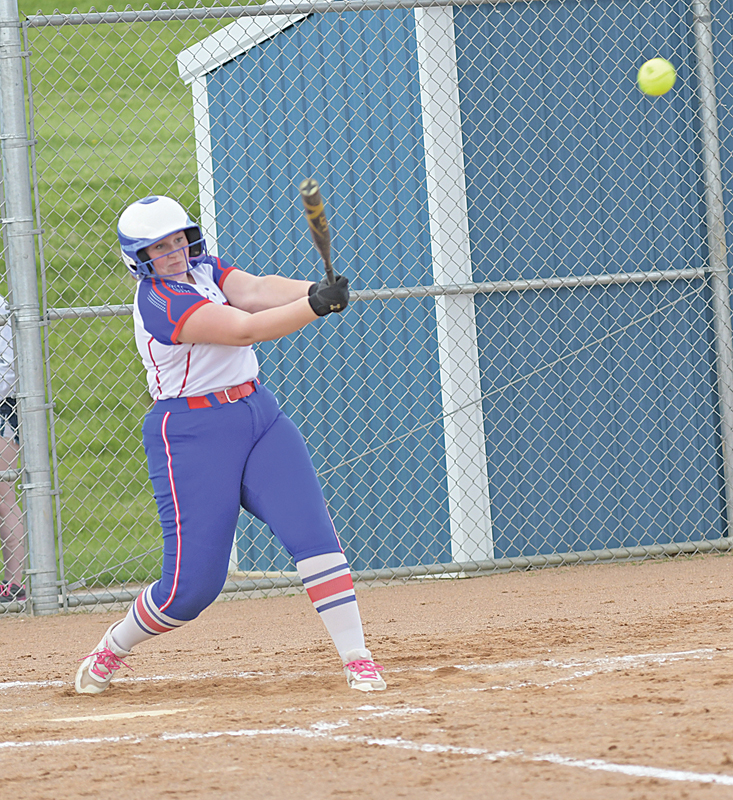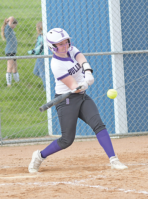 HILLTOPPER Kiley Leduc smacked this first-inning double for a couple of RBIs during a May 9 home softball game against the rival Bulldogs. Glenwood City led 5-4 after the first inning, but Boyceville went on to win the contest 15-8 to sweep the season series.
