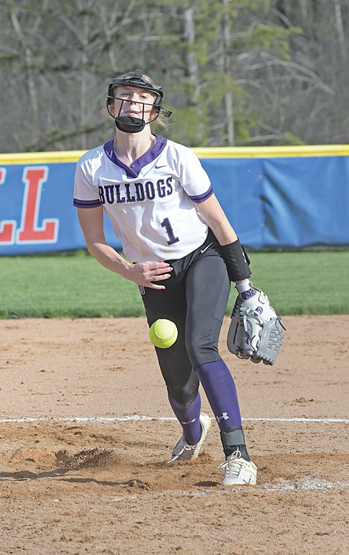 FRESHMAN Aubrey Malean threw a pitch home during the Bulldogs’ May 9th game in Glenwood City. Malean threw a complete game, striking out ten Hilltoppers to help her Bulldogs earn the season sweep of their rivals with a 15-8 win. —photo by Shawn DeWitt