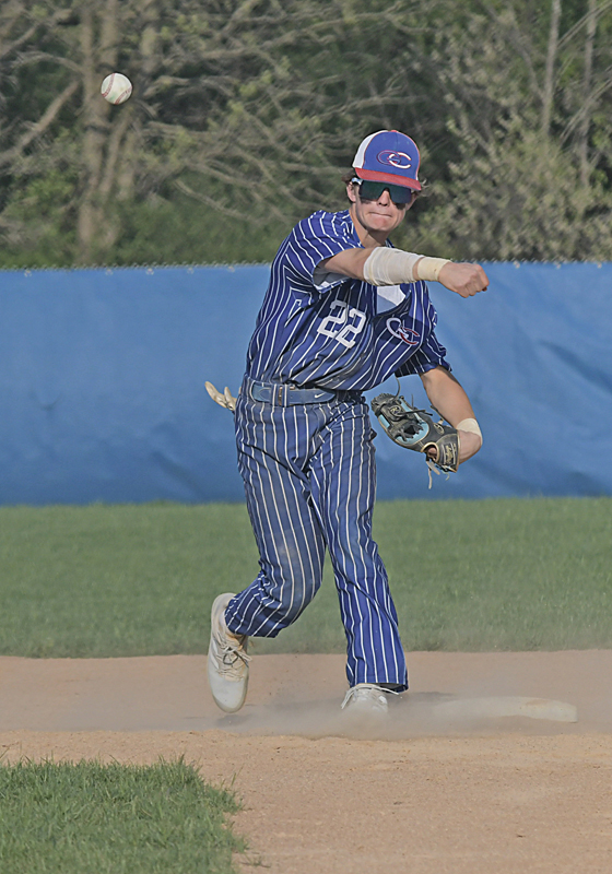 GLENWOOD CITY shortstop Brock Wood threw the baseball to first base during a May 13 Dunn-St. Croix baseball game at home against Colfax. Wood went 3-for-5 batting with a pair of doubles in the Toppers’ 16-6 win. —photo by Shawn DeWitt