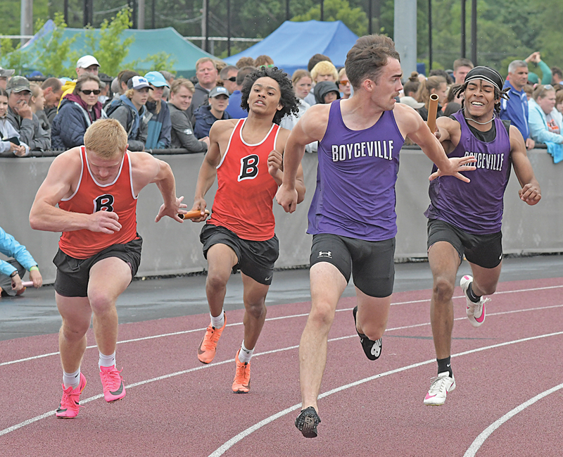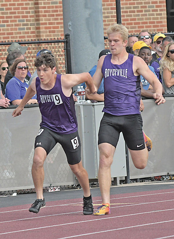 BULLDOG SENIOR DUO — Peter Wheeldon (front) looked back to take the baton from Caden Wold during the Saturday, June 1 running of the Division 3 4×200 meter relay finals. Boyceville finished seventh in the event. —photo by Shawn DeWitt