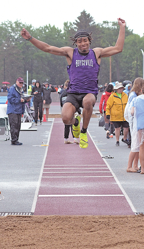 WOLD WINS STATE LONG JUMP — Boyceville senior Caden Wold is shown flying through the air during the Division 3, long jump competition Saturday, June 1 at the 2024 WIAA State Track and Field Championships in La Crosse. Despite some rain, Wold lept a school record 22 feet 10.75 inches to win the state championship after finishing second in the event last year. Wold also competed in the triple jump and 4×200 meter relay during the two-day state meet. Please see sports for the complete story. —photo by Shawn DeWitt