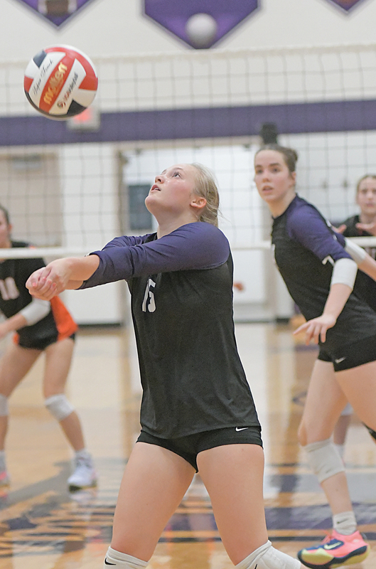 DELANEY OLSON is shown receiving the volleyball during the Dunn-St. Croix Conference opener in Boyceville September 19. The Bulldogs defeated Elk Mound in five sets. —photo by Shawn DeWitt