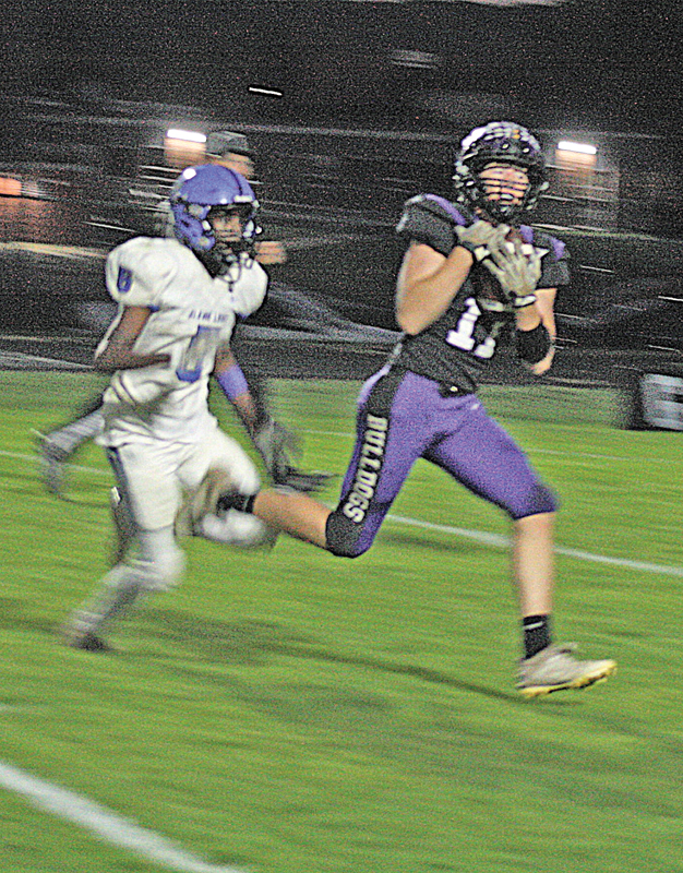 BOYCEVILLE’S Landyn Leslie (#11) cradled one of his two touchdown catches in the Bulldogs’ 58-10 homecoming win over Clear Lake September 27. Leslie finished with three receptions for 130 yards and rushed twice for 42 yards. —photo by Joel DeWitt